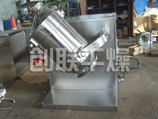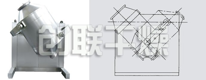 裝料的筒體在主動(dòng)軸的帶動(dòng)下,作周而復始的平移、轉動(dòng)和翻滾等復合運動(dòng),促使物料沿著(zhù)筒體作三向復臺運動(dòng),從而實(shí)現多種物料的互相流動(dòng)、擴散、積聚、摻雜.以達到均勻混合的目的。