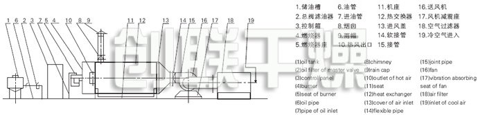 型號 | 燃燒器型號 | 燃油量kg/h | 供熱量104kcal/h | 外形尺寸L×W×Hmm | 熱風(fēng)口L×Wmm | 總重kg |